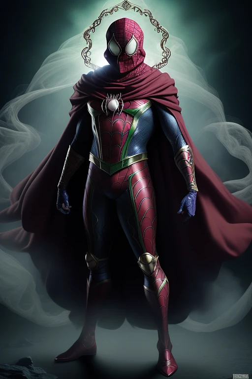 mysterio, a formidable villain, real spiderman costume, full body shot, wears a deep red costume with intricate patterns resembling flowing smoke, high-collar cape billows dramatically, ((distinctive helmet with a rounded fishbowl-like dome) ), conceals his face while housing swirling mist effects, enhance his illusionary powers