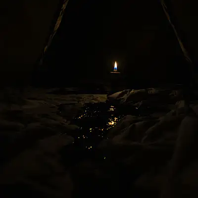 First-person POV , I am lying on the ground, staring ahead. The canvas walls of the tent sway gently with the night breeze. Darkness fills the space, with only a dim light flickering nearby. In my hand, I hold a sword, its tip resting on the ground. The night outside is still, but the tension lingers in the air. realistic. high details.