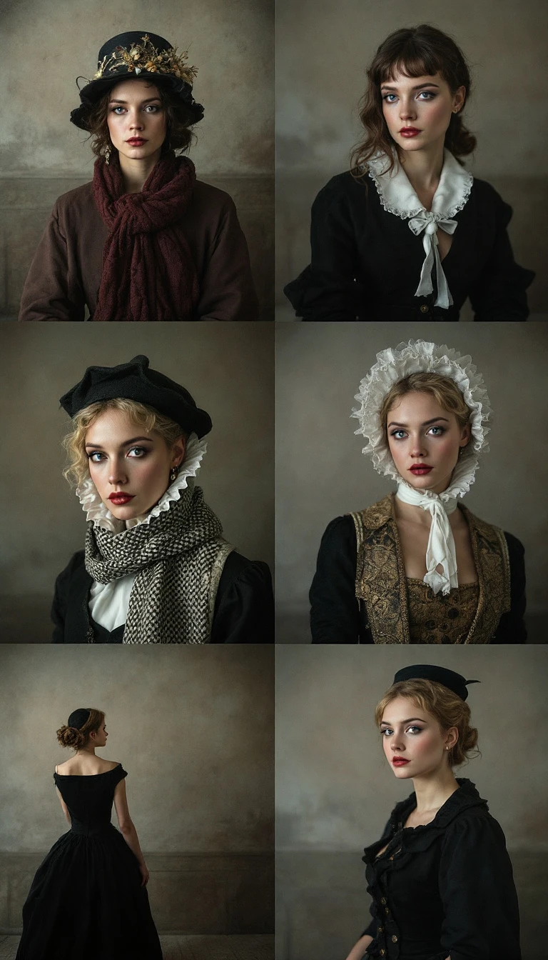 (17) A conceptual photography series, inspired by the staged portraits of Cindy Sherman, features a female historian, each photograph capturing her in a different historical role, her attire and pose embodying the spirit and context of that time period, creating a powerful exploration of identity and time. Conceptual art, performance, historical, photo realism.