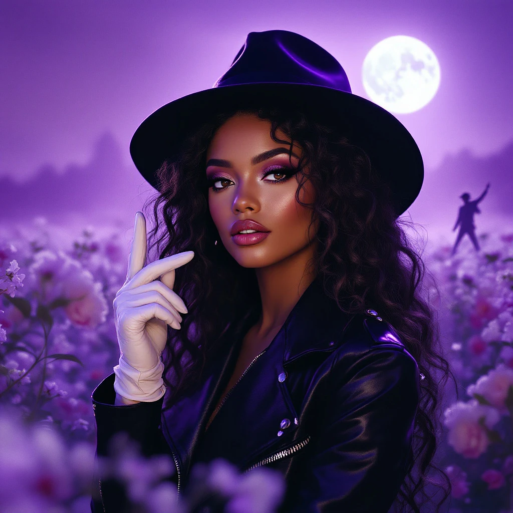 Portrait of a stunning woman in the foreground, strongly reminiscent of Janet Jackson in her prime, with long, curly hair styled exactly like Michael Jackson’s signature look, wearing a stylish fedora hat and a single white glove, flawless skin, bold eyeshadow and a high-fashion black leather jacket with silver accents—bathed in soft purple moonlight, full moon glowing overhead above a misty flower field, subtle translucent silhouette of Michael Jackson in the background striking his signature one-gloved finger-point-to-the-sky and mid-moonwalk gesture—recognizable yet ethereal, cinematic lighting, hyper-realistic digital painting, 8K —ar 2:3 —v 5 —q 2