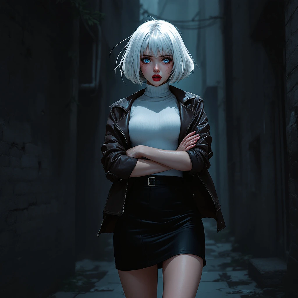 anime, woman, white hair, bob cut, blue eyes, freckles, red lips, white turtle neck sweater, tight turtle neck sweater, short leather jacket, brown leather jacket, black tight skirt, short skirt, bare legs, black high heels, scared expression, big chest, arms crossed, walking in a dark alleyway, full body