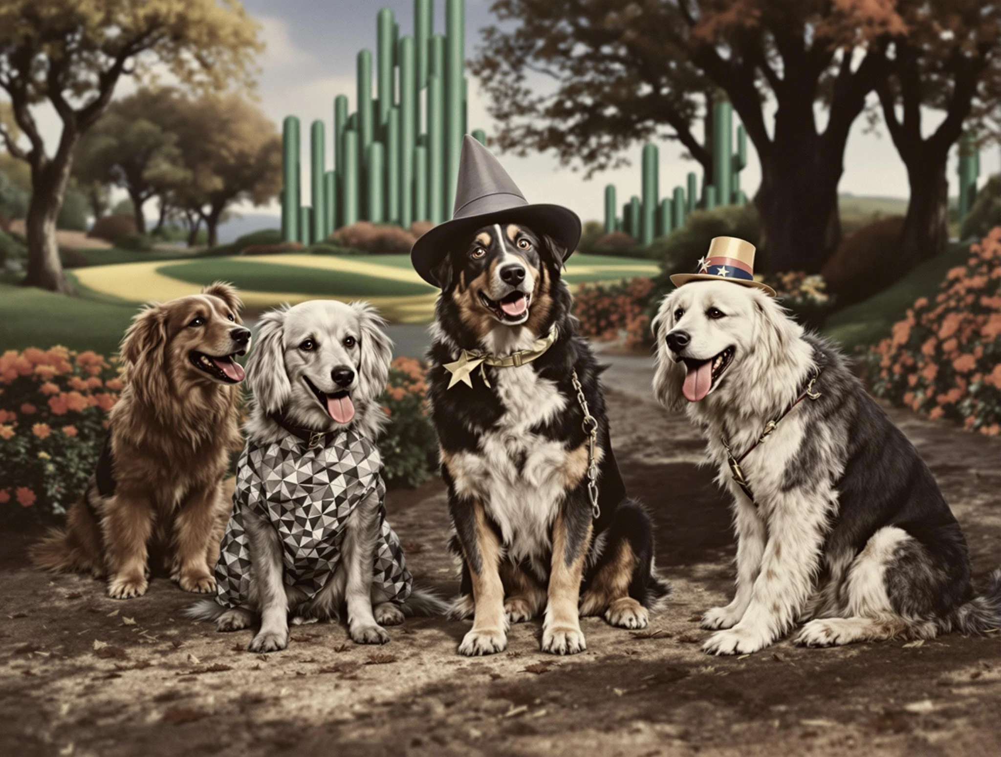 Photorealistic, a movie still of the cast of the wizard of oz as dogs, vintage photograph, candid image