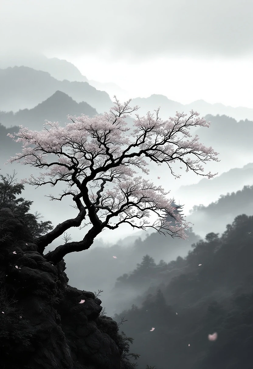 cinematic grayscale, traditional Japanese tree, foggy layered mountain valley, same tone and color scheme as final pagoda, monochrome with soft warm highlights if needed, minimal natural shape, elegant branches extending from frame edges, no centered tree, few subtle blossoms only, no heavy foliage, soft pink petals drifting gently, very minimal, atmospheric, misty ink-wash aesthetic, cinematic depth, peaceful silence, timeless and moody, matches final pagoda scene in lighting, energy, and presence