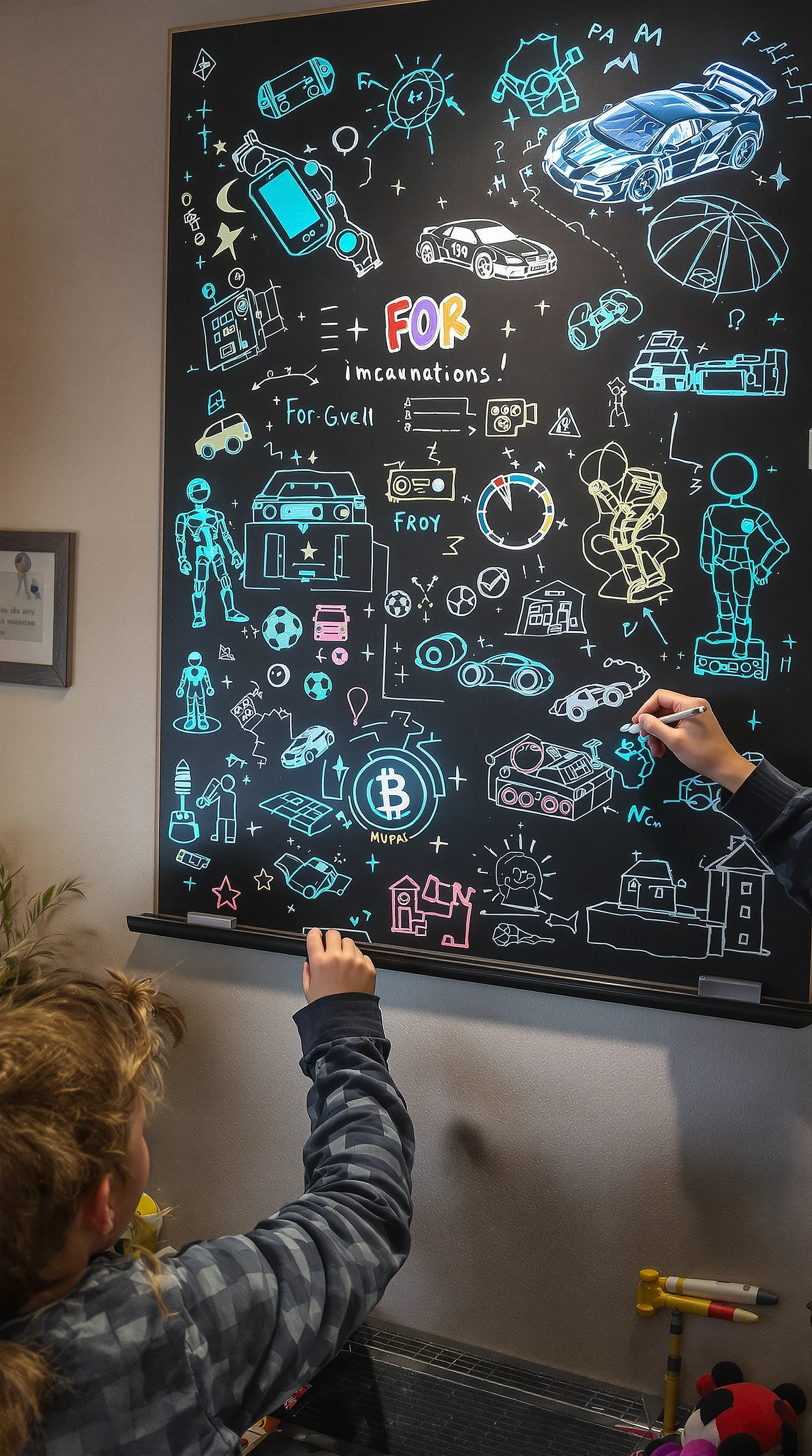 Macroview of a blackboard in a family house room, 2 children hands drawing ultrarealistic holographic imaginations, toys, supercars, mum, dad, ultrarealistic, 8K.