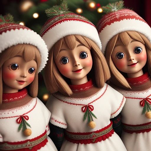 Lapland Christmas, a close up of a three cute smiling Sami blythe dolls big eyes, smiling, wearing traditional Sami dresses, extremely detailed, cinematic, professional, masterpiece, beautiful, realistic, best quality, dynamic angle, highly detailed face,