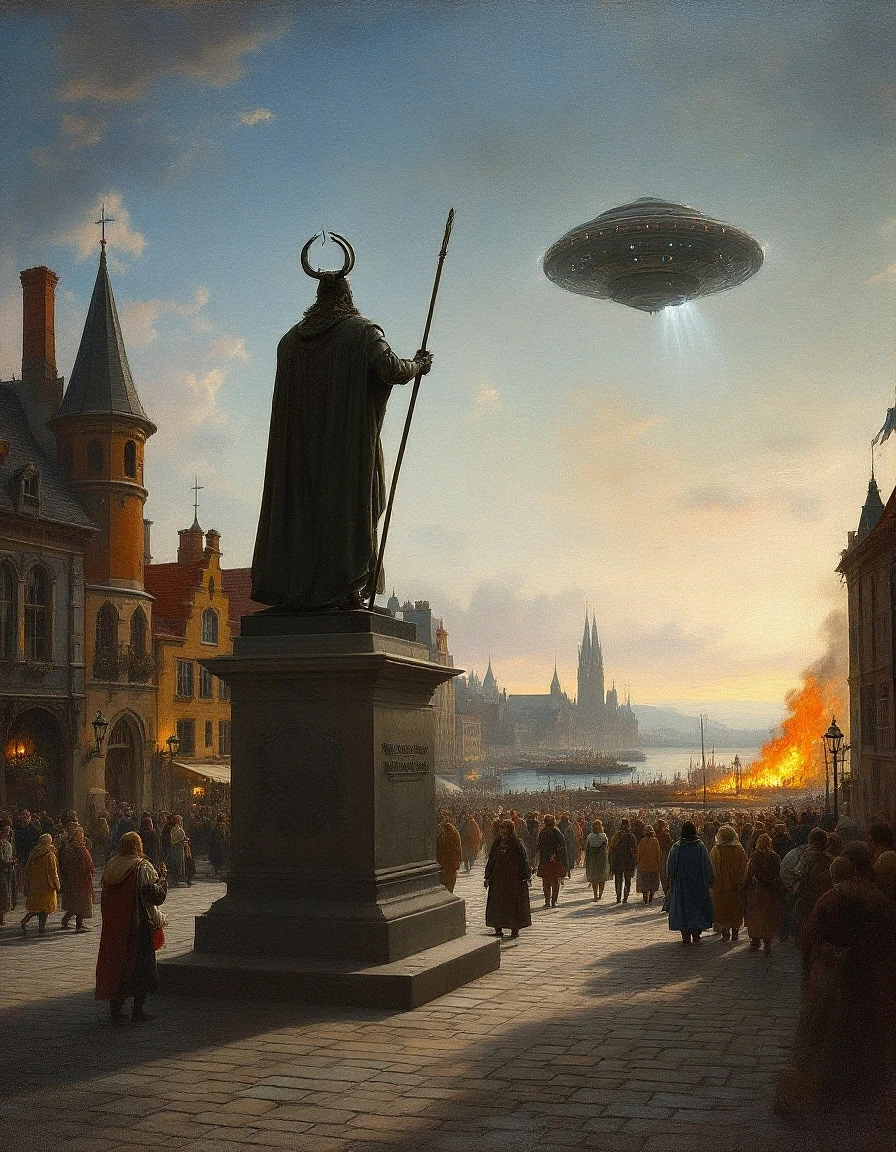 A painting inspired by Jan van Eyck of a bronze statue of a Viking lord in a town square. Townsfolk walk in a line to the harbor on the way. Fires burns in the distance. a ufo zips across the sky nearly imperceptable