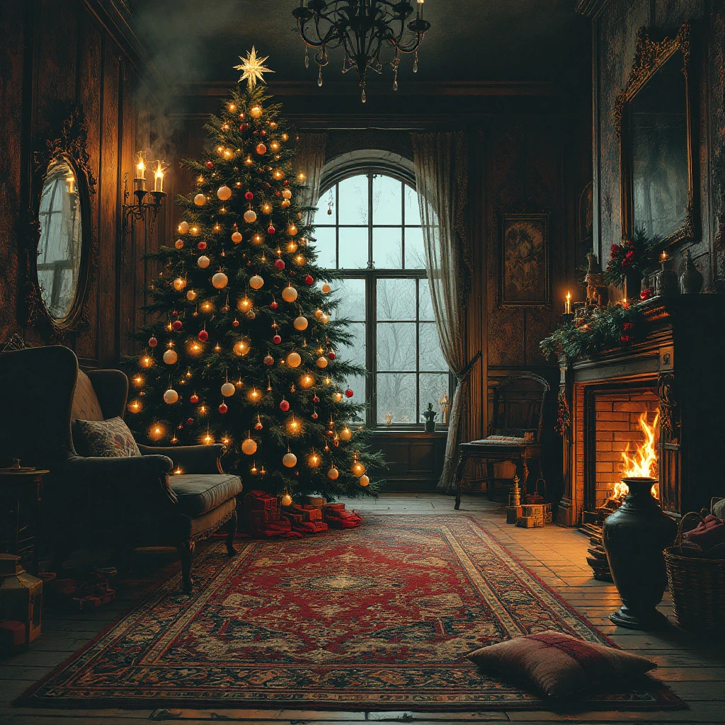 Create a Victorian Penny Dreadful comic-style image depicting a Christmas tree in1880s Austin, Texas home with flickering gas lamps open fires. With a looming air of terror adding an eerie ambiance. The atmosphere should feel dark, mysterious, and ominous, with fine detailing reminiscent of Victorian-era illustrations.