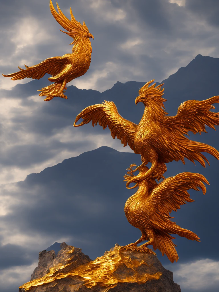 A majestic phoenix with vibrant plumage, its fiery wings spread wide, golden feathers illuminating against a dark sky, perched atop a rugged mountain peak, surrounded by swirling clouds, capturing the phoenix's grace and intensity, Sculpture, bronze casting, 8k high definition --ar 1:1 --v 5