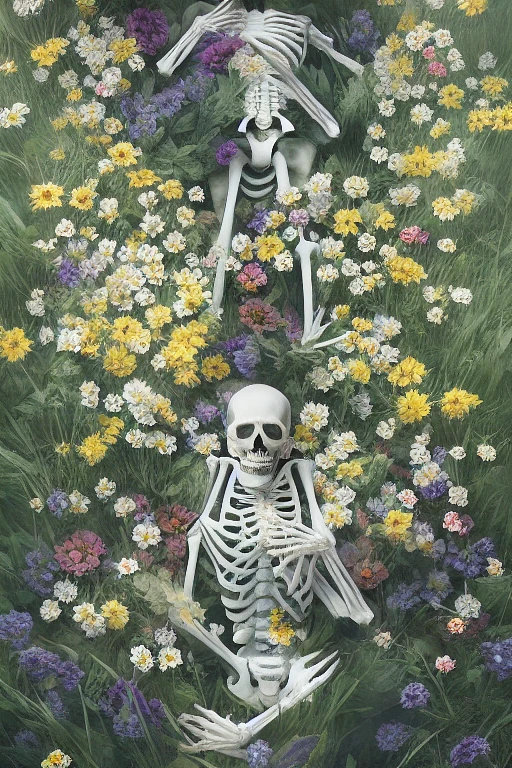full length portrait matte painting of [skeleton:flowers:30] | laying in the ground| with a circle of flowers around| symmetry| masterpiece| highly detailed| intricate| digital art| soft lighting| by Ruan Jia and Mandy Jurgens