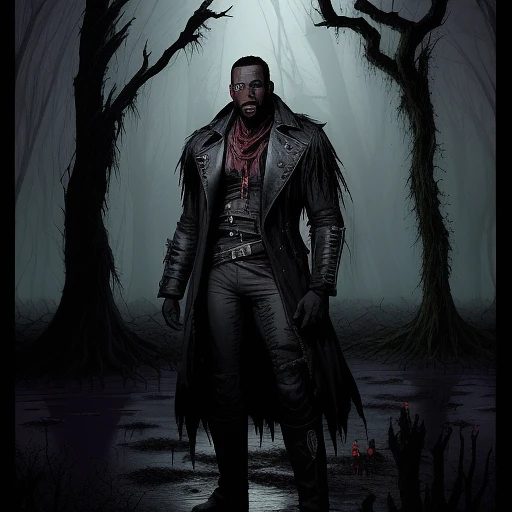 A black man, in a torn trentchcoat, blood stained, a necilace with a single eyeball is around his neck, stands gazing across a stirring, bubbling swamp at Ravens nest. at Ravens Nest, a dark castle, built of dead trees and glowing caverns. In the style of a comic book cover. Issue no. 1. Title Adventures of Akai-Zar Valious.