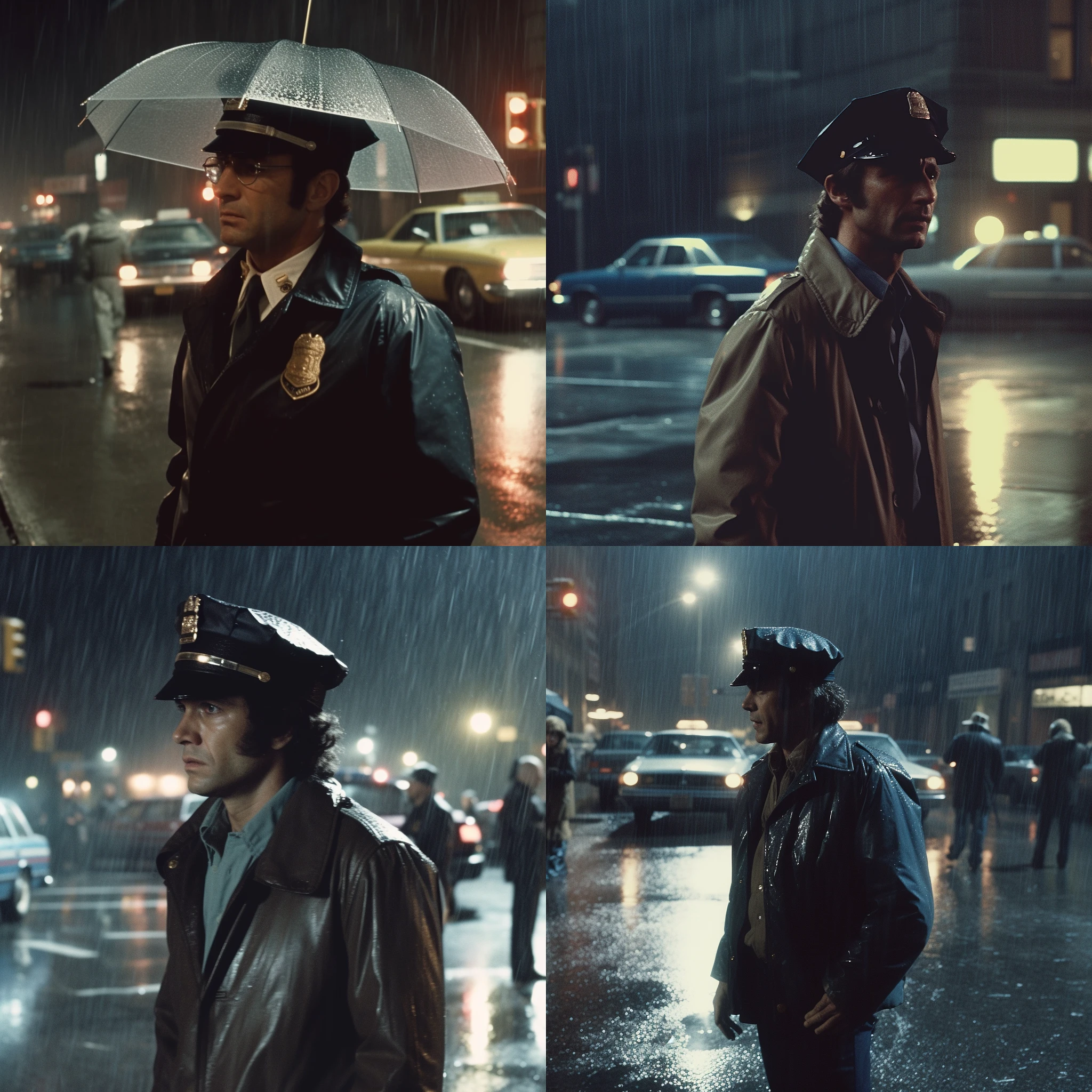style from a 70s movie, cop wearing street clothes, dark rainy New York street, film grain, movie set --v 5