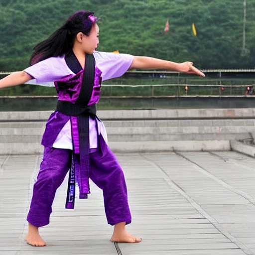 A purple-haired, fair-skinned young female warrior practices martial arts on the Nanjing Yangtze River Bridge