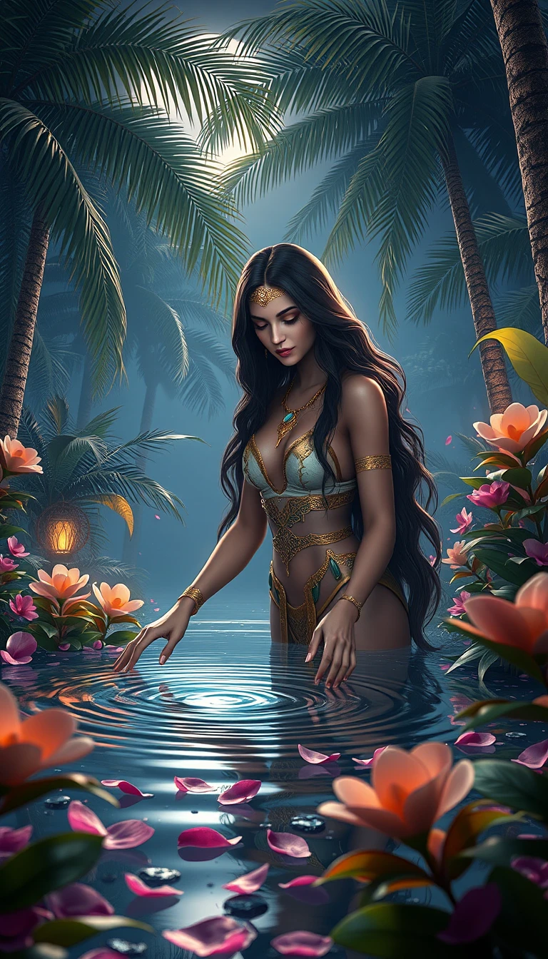 an enchanting, mystical scene featuring Ishtar in a lush, moonlit oasis, surrounded by palm trees, flowers, and a tranquil pool of water. Render the environment with meticulous attention to detail, using 3D techniques to create realistic foliage, petals, and water droplets. Depict Ishtar with a serene, alluring expression, her hands gently touching the surface of the water, creating ripples that reflect the moonlight. Use subtle, soft lighting effects to evoke the tranquility