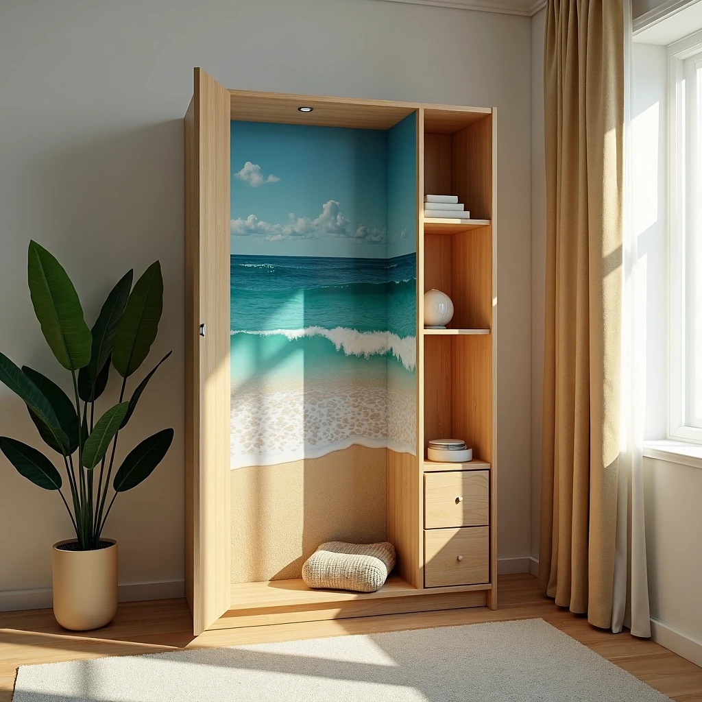 in an ordinary room , there is a wardrobe with shelf containing on it's surface a small microworld sandy beach with ocean waves, the wardrobe contrasts with the ordinary boring room around it