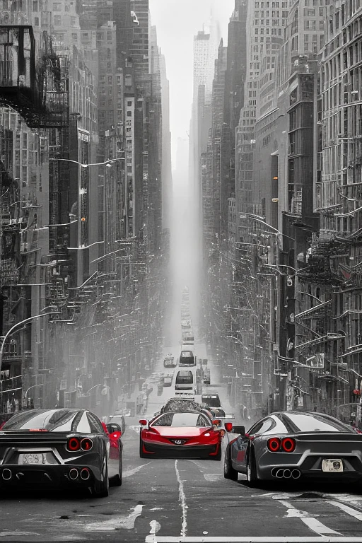 Street of New York. Ferrari in New York City. Top of ESB in fog. Light painting cars. Woman cross the street.