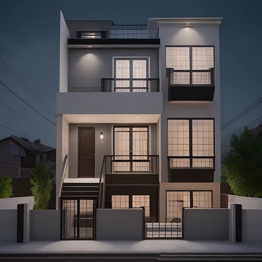 3 story residential house front exterior design, 24x40 size row house, modern look, use night lights, high quality render, 8k