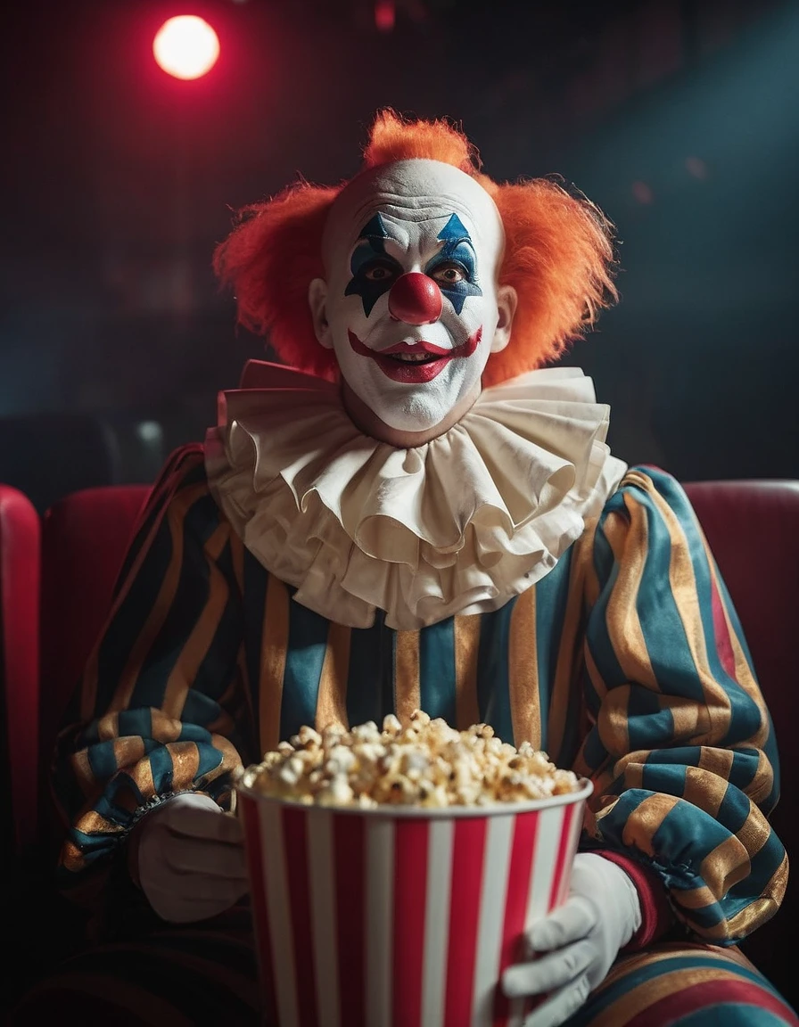 best quality, 4k, highres, masterpiece, ultra-detailed, realistic, alone scary clown in with popcorn watching a movie at the cinema, dark atmosphere, glowing, cinematic, epic, dramatic ambient, highly detailed, extremely professional, transparent, best, real, deep, dynamic, light shining, sharp focus, artistic, complex, intense, cool, shiny, amazing, brilliant, colossal, singular, creative, pure, perfect, calm, beautiful