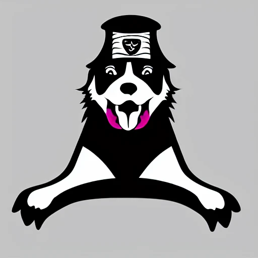 black and white vector graphic of a happy Siberian husky with his tongue out dressed as a pirate wearing a captain's hat and an eyepatch