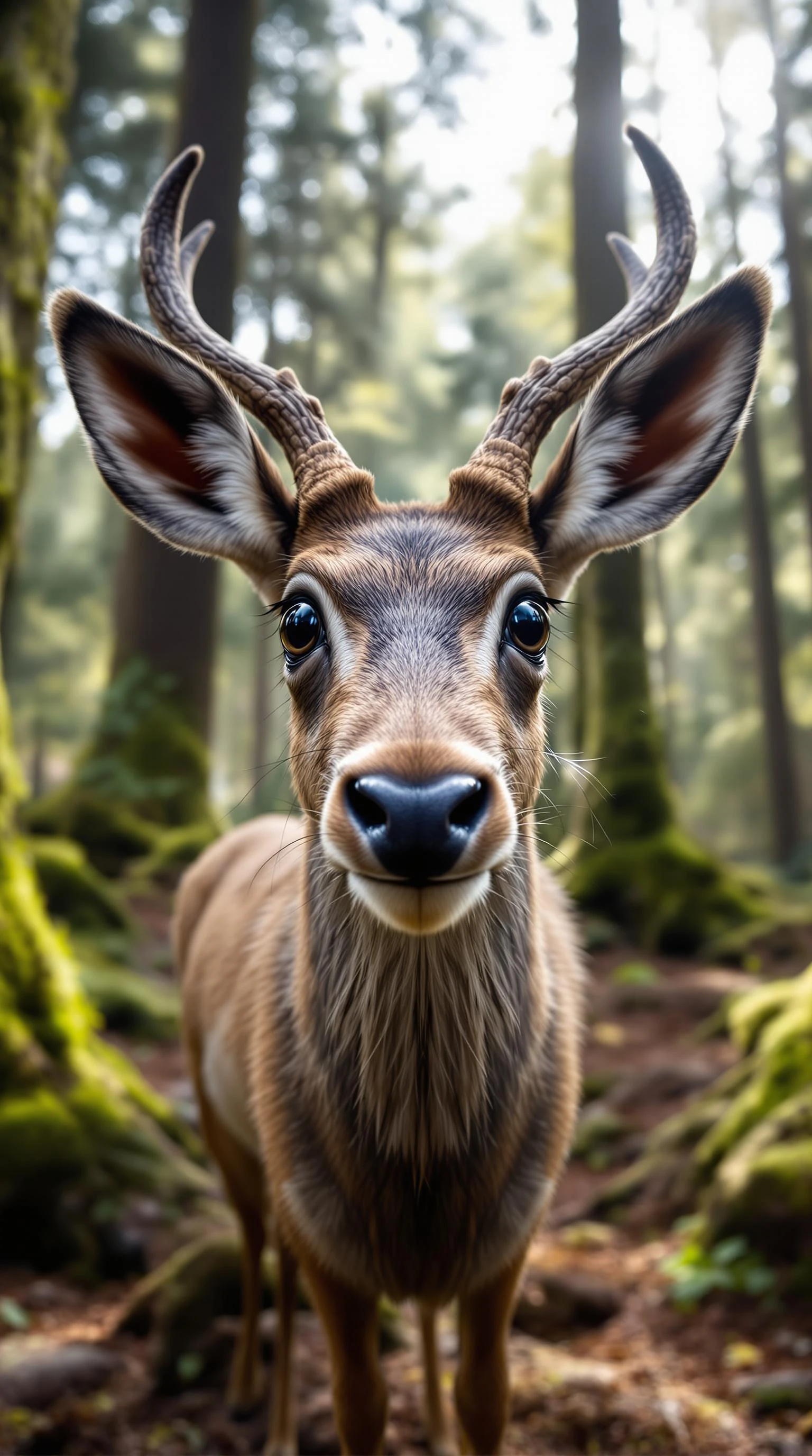 "A close-up view of a musk deer (kabaraga) standing in a natural forest setting, looking directly into the camera. The animal’s large, dark eyes are expressive and captivating, and its unique elongated fangs are visible, giving it a striking and almost mystical appearance. The musk deer’s sleek fur is shades of brown and gray, blending beautifully with the forest surroundings. The background is softly blurred, featuring tall trees, moss, and dappled sunlight filtering through the canopy, creating a serene and enchanting atmosphere that highlights the rare beauty of this elusive creature. "