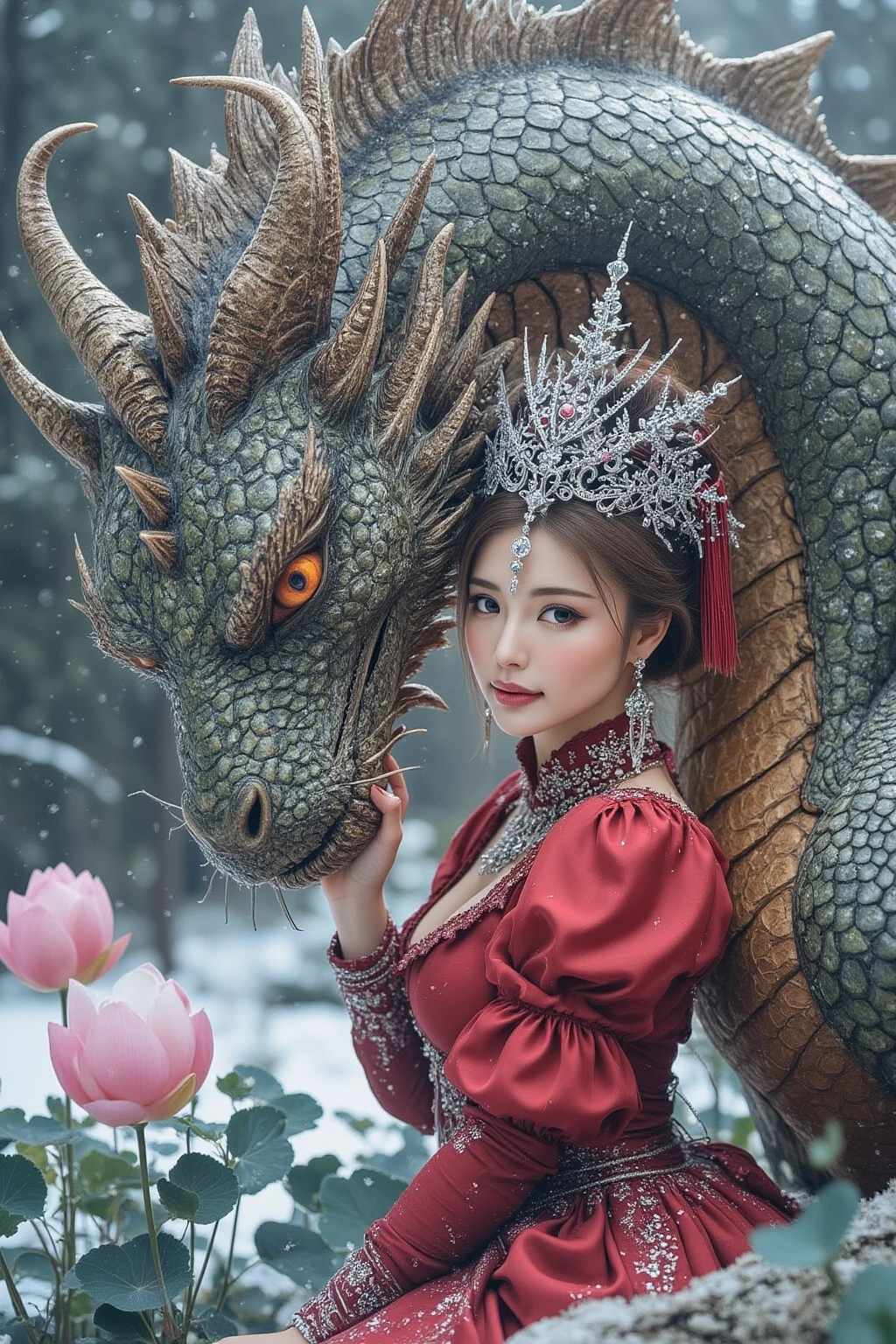 This is a majestic and highly detailed fantasy portrait that depicts an intimate and powerful bond between a regal japanese woman and a formidable iron-rusted dragon. The scene is set in a cool, wintry landscape, creating a stunning contrast between the cold environment and the warmth of the connection between the two figures. The artwork has a hyper-realistic yet stylized quality, blending elements of high fantasy, royalty, and nature. The Regal Woman: The woman is the central human figure, exuding an aura of grace, power, and serene beauty. Face and Makeup: She has fair, almost porcelain-like skin and delicate East Asian features. Her makeup is immaculate, with sharply defined, winged eyeliner, a subtle smoky eyeshadow in reddish tones, and a soft blush. Her lips are a rich, matte red. Her expression is calm and confident as she gazes directly at the viewer. Headdress: Her most striking feature is an elaborate headdress. It has an intricate, crystalline tiara made of silver or platinum, studded with glittering red gemstones. Gown and Jewelry: She is dressed in an opulent gown of a rich scarlet satin. The dress is exquisitely detailed with a high, ruffled collar, voluminous puffed sleeves, and layers of fabric. It is adorned with delicate, sparkling silver embellishments that resemble crystallized snowflakes, tying her attire to the wintery setting. Her jewelry is equally ornate, including long, dangling chandelier earrings and a matching high-necked necklace, all crafted from the same silver and gemstone materials as her tiara. On her right hand, which gently touches the dragon, she wears a silver ring. The Majestic Dragon: Positioned closely beside the woman is a massive and powerful dragon, likely a Western type in appearance. Appearance: The dragon is rendered in incredible detail, with a hide of deep, iron-rusted scales that have a rugged, armor-like texture. Sharp, formidable horns and spines run along the crest of its head. Eye and Expression: Its visible eye is a focal point, glowing with an inner light. The iris is a fiery orange-yellow with a slitted reptilian pupil, suggesting ancient wisdom and intelligence. Despite its fearsome appearance, the dragon's posture is one of calm and affection, leaning its massive head into the woman's gentle touch. It appears to be her guardian, companion, and confidant. Setting and Atmosphere: The figures are situated in a snowy, mystical forest. Environment: The background is softly blurred, creating a shallow depth of field that keeps the focus entirely on the woman and dragon. The ground is covered in white snow, and the dark, indistinct shapes of trees can be seen behind them. Lighting and Color Palette: The scene is bathed in a cool, blue-toned light, characteristic of twilight or an overcast day in winter. This cool palette is beautifully contrasted by the vibrant purple of the gown, the deep green of the dragon, the warm pink of the lotus, and the fiery glow of the dragon's eye. The overall mood is one of quiet magic, strength, and serene harmony.