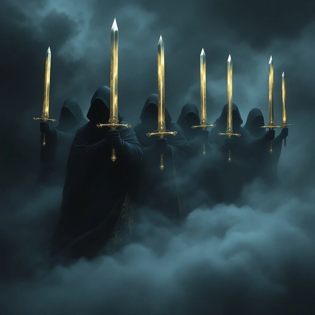 Shrouded in dense, swirling fog, seven swordsmen stand in eerie silence, their presence both ominous and majestic. They are clad in heavy black mantles, the fabric rich and textured, adorned with intricate golden embroidery that glows faintly in the dim light. Their deep hoods cast shadow over their faces, obscuring their features, leaving only the impression of unseen, watchful eyes. In their gloved hands, they grip magnificent golden swords, their blades polished to a mirror-like sheen, reflecting the cold, diffused light of the misty surroundings. Each weapon is raised high, the edges sharp and flawless, exuding a quiet but undeniable aura of power. The fog swirls around their feet, rolling like a living entity, partially concealing the ground beneath them. Every detail—the metallic glint of the gold, the folds of their cloaks, the condensation on their blades—appears with an almost hyper-realistic sharpness, as if captured in an ultra-high-definition photograph. The scene is haunting, frozen in time, an image of silent, otherworldly warriors standing as if waiting for an unspoken command. , 8k