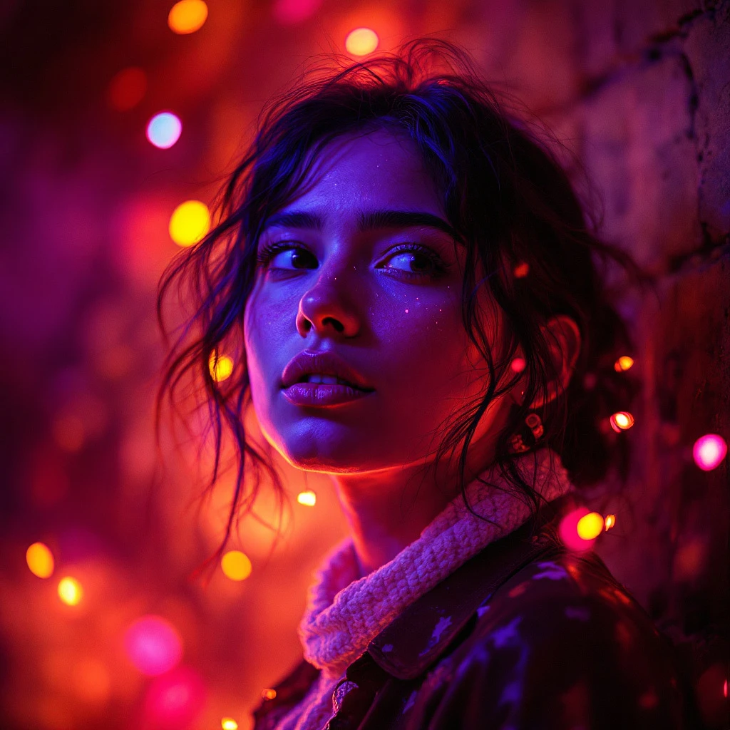 young mapuche woman thinking with her mind, passionate, happy and quirky full of pastel color, light painting, bokeh, hyperspectral imagery, telephoto, electric colors, fluorescent, film lighting, dust, electricity, post processing --ar 9:16