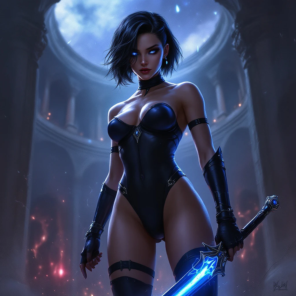 digital painting in the style of warhammer 40k of a young female comissar, standing infront a gothic circh, holding a sabre with blue lightning, cybereyes, black ultra tight onepiece bathsuit, black sidecut hair, very big tits