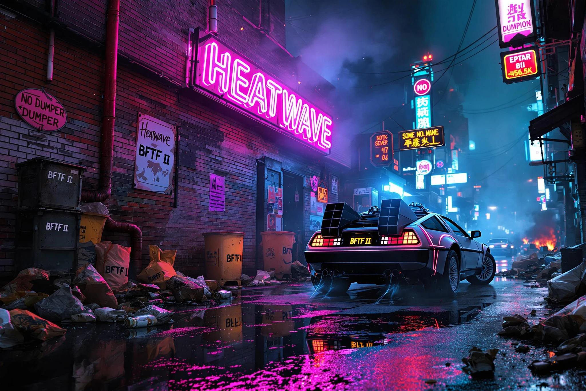 A hyperrealistic 8K cinematic masterpiece blending the gritty, neon-soaked aesthetic of a cyberpunk 1980s Tokyo alleyway with the intense action of a high-tech, futuristic battle. The scene unfolds in a dark, chaotic urban sprawl, alive with swirling fog and flickering neon lights that cast erratic, vivid glows of pink, blue, and fiery amber onto weathered brick walls and reflective puddles on the wet pavement. In the foreground, a stunning female android combatant crouches in the center of the action. Her sleek metallic body is meticulously designed with an anatomically accurate human form, featuring the correct number of limbs, joints, and fingers, each crafted with hyperrealistic precision. Her long, flowing hair, partially synthetic, appears alive as it dances in the subtle, ambient breeze. Her piercing blue glowing eyes exude a sense of unrelenting focus and power. She wields a futuristic laser gun, its barrel emitting a faint blue glow, and her stance conveys readiness and lethal precision, blending strength with elegance. The reflection of surrounding neon lights shimmers across her body, emphasizing the detailed craftsmanship of her design. At the top of the scene, a massive neon sign reading "HEATWAVE" is prominently displayed. The sign glows intensely in vibrant shades of pink and blue, its large, capitalized letters outlined in bright neon tubing. It is mounted on a weathered brick wall, flickering slightly to convey the wear of time. Sparks shoot intermittently from damaged sections of the sign, with one or two letters dimmed or slightly cracked for an authentic dystopian feel. The word "HEATWAVE" is unmistakable, drawing immediate attention as a centerpiece of the composition, its neon glow providing dramatic illumination to the entire scene. Next to the android, an iconic DeLorean car is parked at an angle, its gull-wing doors slightly ajar. The car’s polished silver exterior reflects the neon ambiance with exquisite clarity. The rear license plate is clearly visible, prominently displaying the text "BFTF II" in bold, futuristic black lettering against a white plate. The plate is framed by subtle metallic accents and surrounded by small scuffs and scratches, emphasizing its authenticity. This detail is carefully positioned in the foreground, ensuring it stands out and is easily readable within the scene's complex lighting. The alleyway is a gritty portrait of urban decay. Overflowing dumpsters with dented lids spill refuse across the ground, including torn garbage bags revealing rotting food, broken glass, and discarded electronic components. A shattered bottle lies next to a large puddle with an oily sheen that reflects distorted neon lights. The walls are covered in layers of graffiti and ripped posters advertising long-defunct products or events, their edges curling from years of exposure to the elements. A faded "NO DUMPING" sign hangs crookedly on one wall, partially obscured by fresh graffiti tags. Rusted trash cans and discarded, crumpled flyers litter the ground, adding to the dystopian atmosphere. In one corner, a rusty pipe leaks a small stream of water, forming another reflective puddle below. In the distance, smoldering wreckage and burning cars cast glowing embers into the smoky, fog-filled air, adding depth and tension to the composition. Volumetric lighting streams through the alley, casting dynamic beams of light that highlight the android’s intricate details, the neon sign above, and the DeLorean’s reflective surface. Every element—from the glowing “HEATWAVE” sign to the unmistakable “BFTF II” license plate and the surrounding gritty details—creates a visually immersive cyberpunk scene with vivid precision.