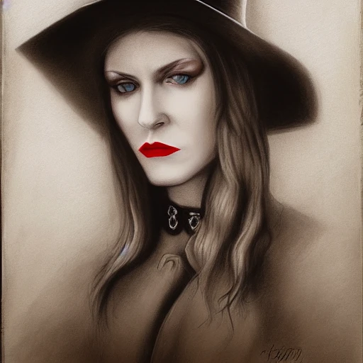 **a drawing of a pale female with straight ginger hair hazel eyes, a serious expression, and red lipstick in the style of wildwest gothic, western-style portraits, sharp focus, moody lighting, realistic figures, wearing a white cowboy hat.