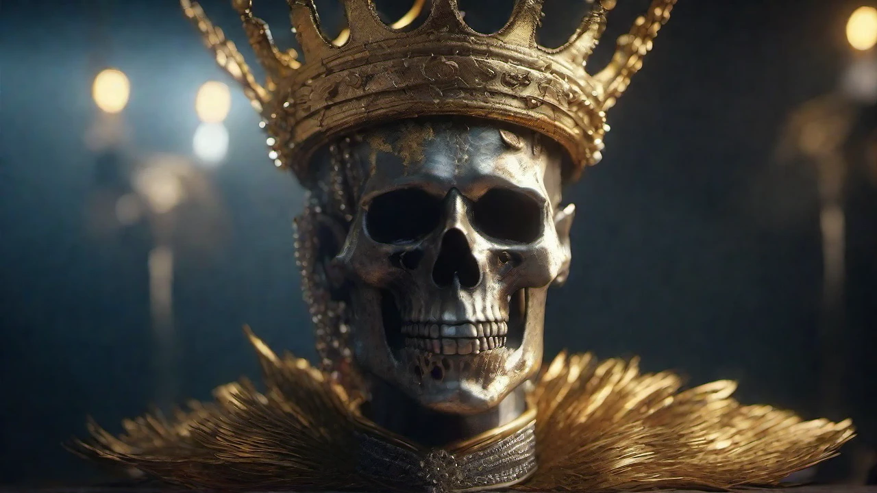 Undead king with golden crown and necklaces, golden sunrays headdress, dead white eyes, dead dry skin, dramatic lighting, photorealistic, 8k