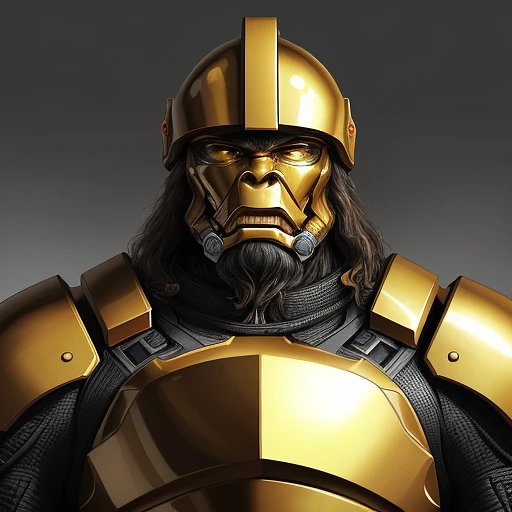 A drawing of supreme commander, still human but with slight Neanderthal-like features, 40 years old, tall and imposing, yellow skin and hairless body are clad in a simple yet impressive technological armor that fits perfectly, especially his helmet, his gaze conveys arrogance, resentment, and brutality yet hides profound sadness, with a proud and upright posture, watches his army marching on a colony orbiting Earth in a futuristic setting. . Both his and his army's armor are as dark as the deepest night, snugly fitted to their bodies.