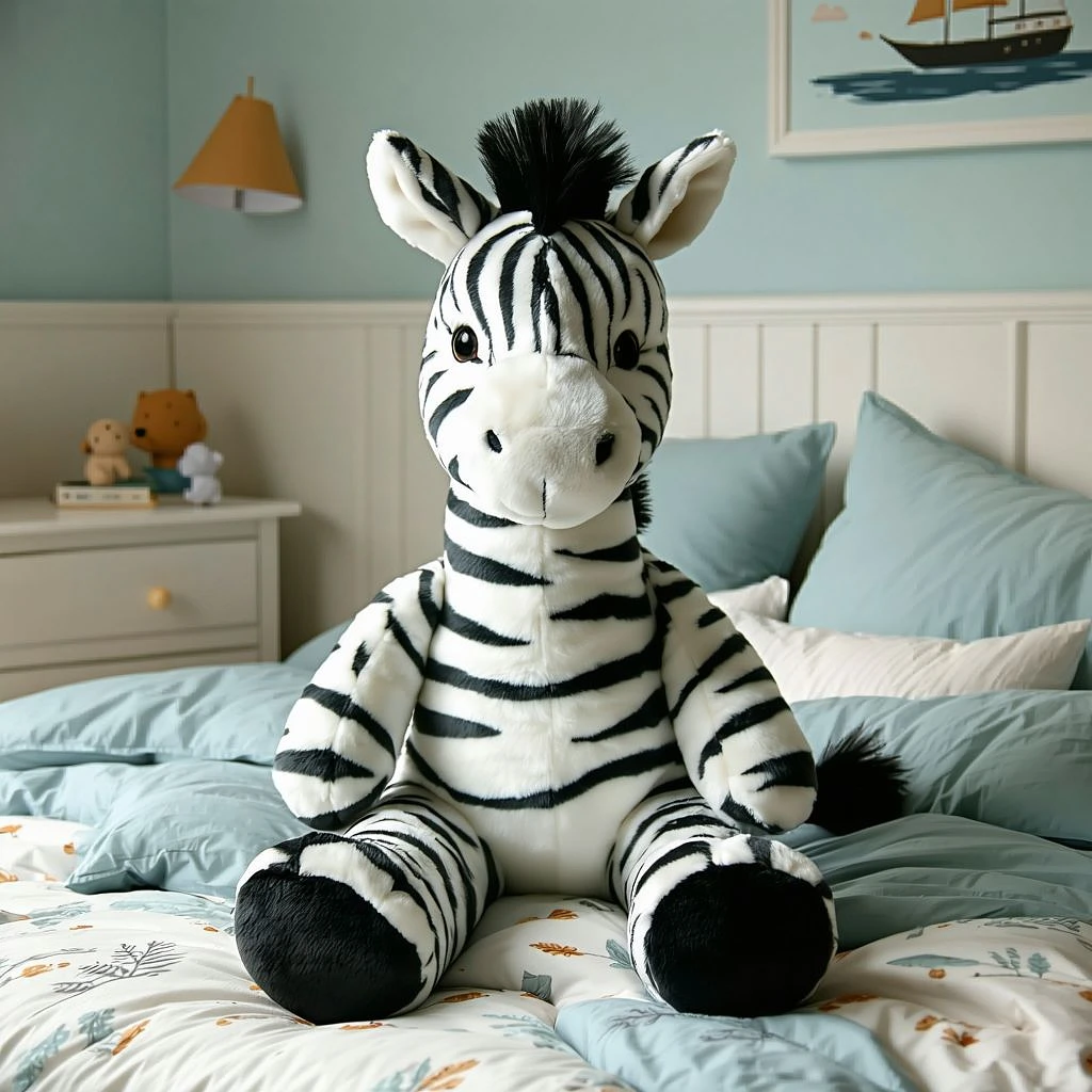 Create an image of a stuffed animal resembling a zebra. The zebra should have its characteristic black and white stripes, a soft and cuddly texture, and a friendly, inviting expression. The backdrop should be a cozy and colorful children's room, enhancing the warmth and playful atmosphere of the scene. Ensure that the zebra plushie stands out as the focal point in the image, appearing adorable and well-crafted. Negative prompt: text, logos, watermarks, out of frame, ugly, extra limbs, extra hands, extra feet, extra fingers, bad anatomy, yacht bigger than bottle, 1:1 bottle Negative prompt: text, logos, watermarks, out of frame, ugly, extra limbs, extra hands, extra feet, extra fingers, bad anatomy, yacht bigger than bottle