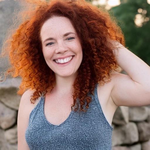 breathtaking woman, spiral curls, long auburn hair, (freckles:0.6) , standing in a stone walkway in a busy city park, tank top, smiling intently at the viewer, sun shining in the background in the late evening . award-winning, professional, highly detailed