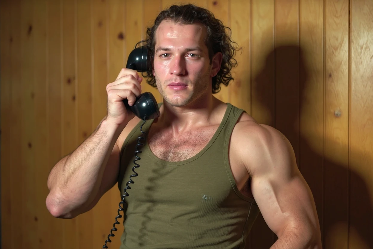 Photographie éditoriale d’un homme jeune, musclé et très poilu, debout devant un mur lambrissé en bois clair, dans un intérieur au style vintage. Il est vêtu uniquement d’un maillot couleur chair. Sa posture est assurée : il tient un vieux combiné téléphonique filaire à deux mains, avec le cordon spiralé projetant une ombre nette sur son torse. Sa peau est ultra brillante, effet shiny, glossy, comme recouverte d’un film huileux ou de vinyle. Chaque relief musculaire capte la lumière du flash, créant des reflets intenses et saturés, presque liquides, avec un rendu plastique ultra-lisse. L’éclairage frontal par flash direct accentue les ombres et les textures, évoquant une photographie mode des années 80. L’ensemble a un rendu hyperréaliste, presque irréel : peau réfléchissante, brillance extrême, grain photo visible, teintes saturées, ambiance volontairement kitsch et sexy, comme une affiche de film rétro ou une photo de calendrier vintage, stylisée à l’extrême.