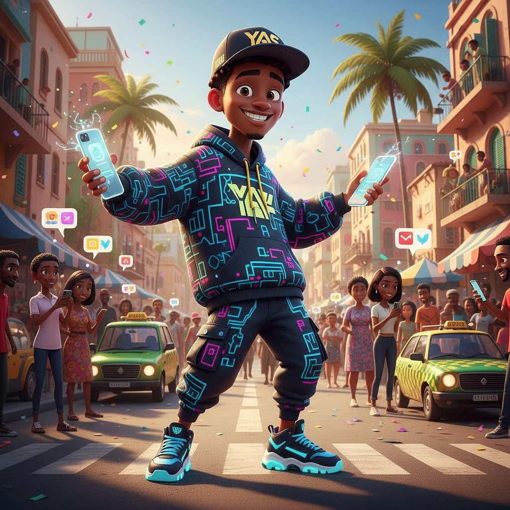 3D animated Senegalese young man, smiling, wearing streetwear with technologie patterns, cap with YAS logo, dynamic pose, vibrant lighting, cartoon style of a multi-racial using their smartphone on a busy street corner, inspired by Disney and Pixar. ” in the streets of dakar