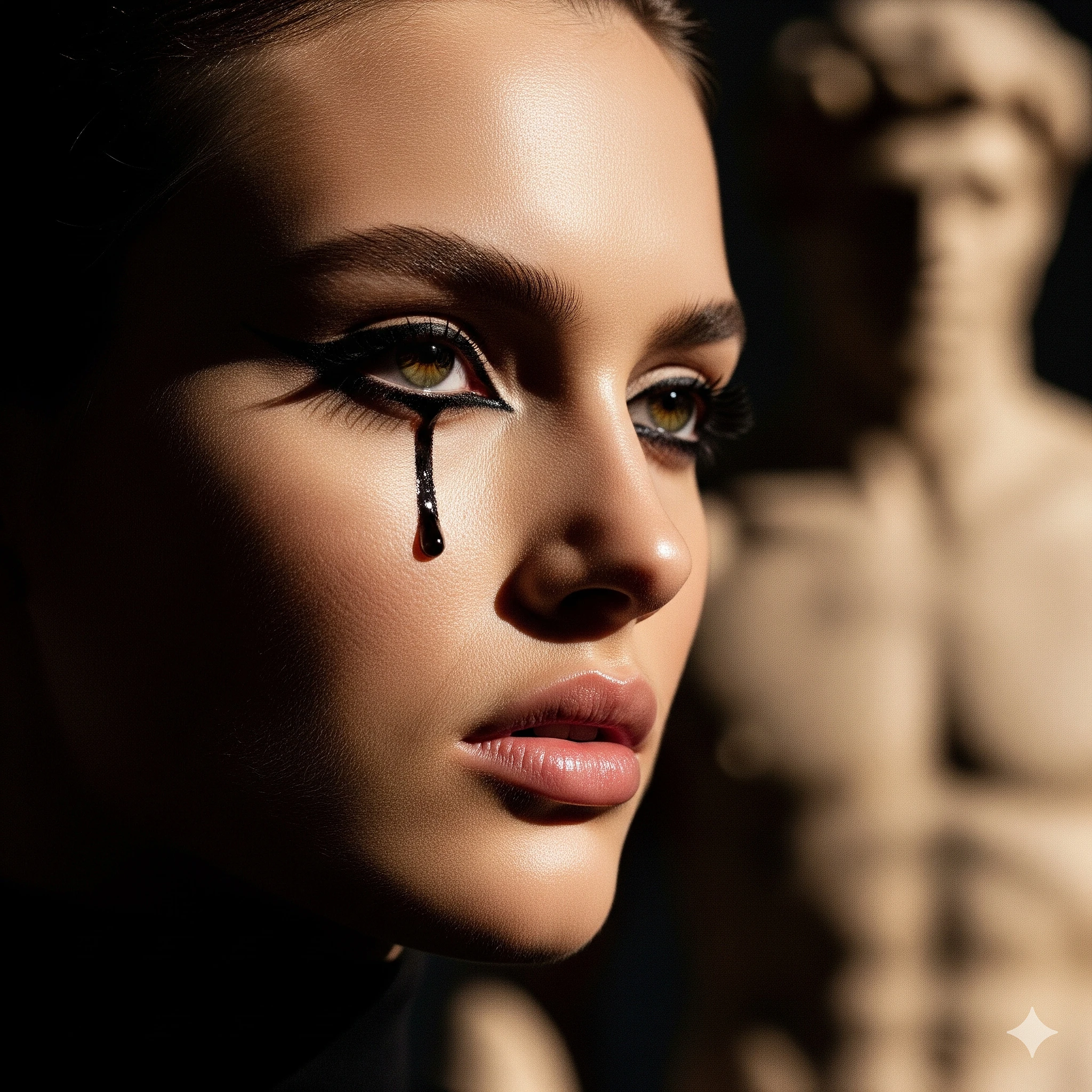 A hyperrealistic, 4K cinematic shot of a beautiful woman with an intense expression. She has flawless skin, full lips, and sharp, graphic eyeliner. A single, dark teardrop reflects the light as it falls from her eye. The scene is lit with harsh, directional light from the side, casting deep shadows and highlighting the texture of her skin. The background is a shallow depth of field, with a mysterious, out-of-focus male statue or figure. This is an editorial shot for a fashion magazine.