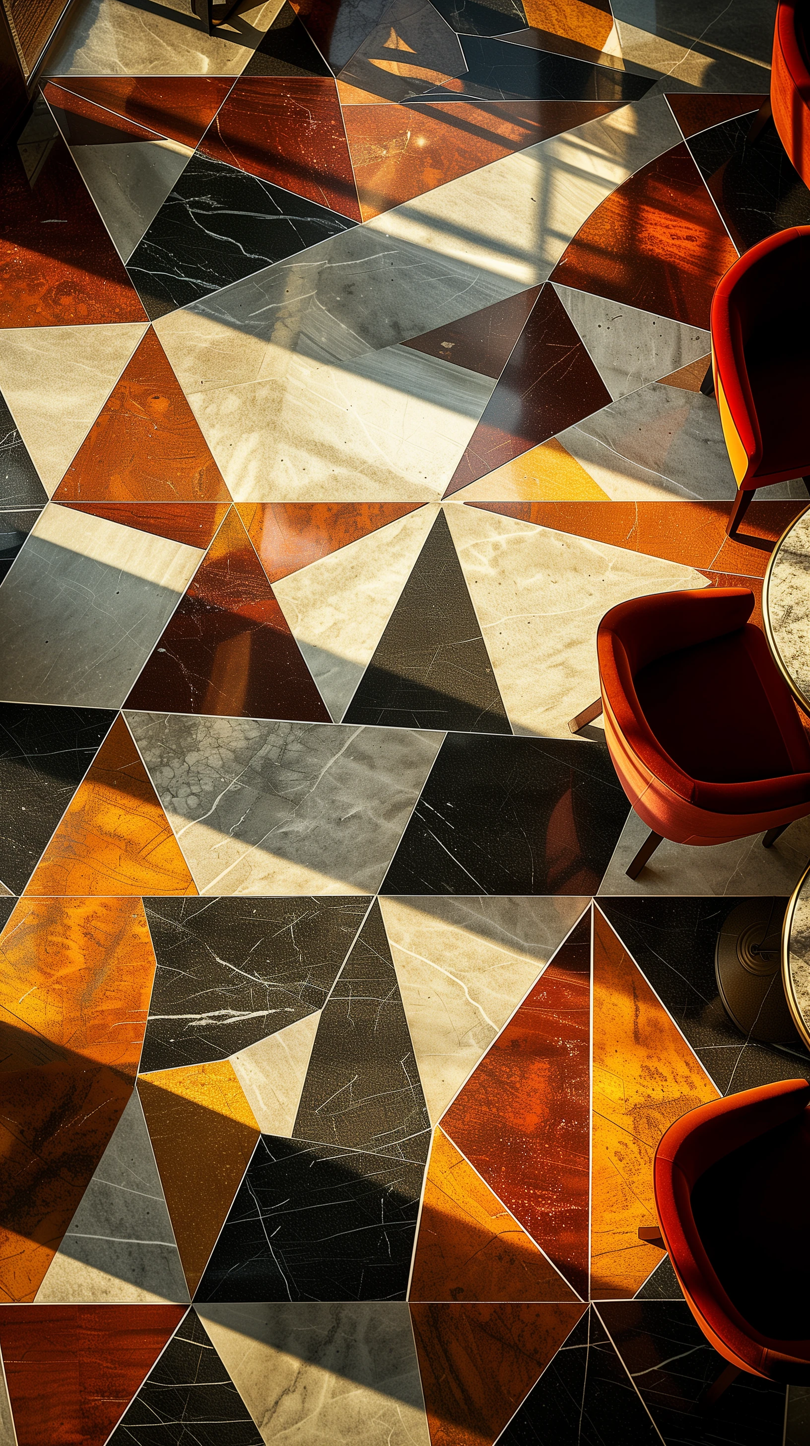 photography, top view, intricate floor pattern, focus on capturing the varied textures and shapes, minimalism style floor pattern design, tiles with triangular patterns in shades of randomly three limits color, possibly a section of a hotel lounge space, pattern is the primary feature, furniture edges a lounge space, casting natural and realistic sun light with soft shadow, soft overhead lighting with subtle shadows from furniture, emphasize the grain of the tiles and the precision of the geometric shapes, enhance the color contrast, giving a more vivid and less naturalistic palette, UHD, detailing --ar 9:16 --style raw