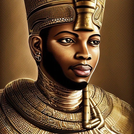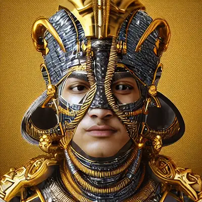Close-up portrait of a Nubian king from ancient egypt walking into no mans land, metallic armor, white black gold, porcelain face, mechanical features, baroque rococo, cinematic lighting, golden ratio, league of legends, dynamic pose, detailed energetic crystal chain wearing armor, sigil metallic armor, cryptic writing, ritual, intricate gold, 3D ornate alter, pineal gland, highly detailed ornaments crystallized black gems, ambient oclusion, highkey photography, bokeh 8K beautiful, detailed scenery, metal diamond design gold photorealistic, insanely detailed and intricate, hypermaximalist, elegant, ornate, hyper realistic, super detailed, 8K --c 50 --v 4