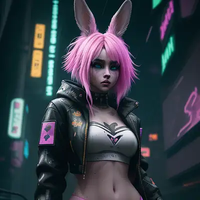 digital artwork of anthromorphic Bunny female, fursona, furry fandom, neon rainy cyberpunk setting, anthro, wearing cyberpunk 2 0 7 7 jacket, detailed face, , (masterpiece:1.1) , ~*~aesthetic~*~, insanely detailed, photorealistic, dutch angle, in the style of Yousuf KarshEnchanting, Ethereal, Mystical, Otherworldly, Magical, Radiant, Whimsical, Dreamlike, Elven, Serene, Spectacular, Fantastical, Enchanted Forest, Mythical Creatures,
