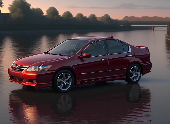 A red honda accord 2 0 0 7 year old honda accord parked by the river bank, on a beautiful riverfront at sunrise, concept art, octane rendering, unreal engine 5, artstation trend, high quality, 8 k, soft lighting, tracing, hyperrealistic, high detail, digital art, symmetrical, cinematic, high coherence, cross rays