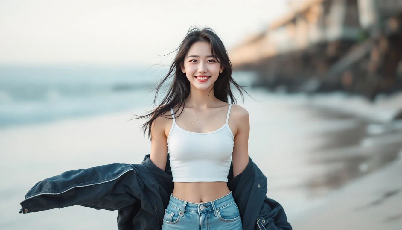 Full body photo of Risa, a Japanese girl, wearing a Cropped waist tank top and short jeans, Make a Smiling brightly face, black brown long hair, walking on the beach and holding a jacket that sways by the wind, soft tones, clear details, portrait photography, shallow depth of field. --ar 16:9