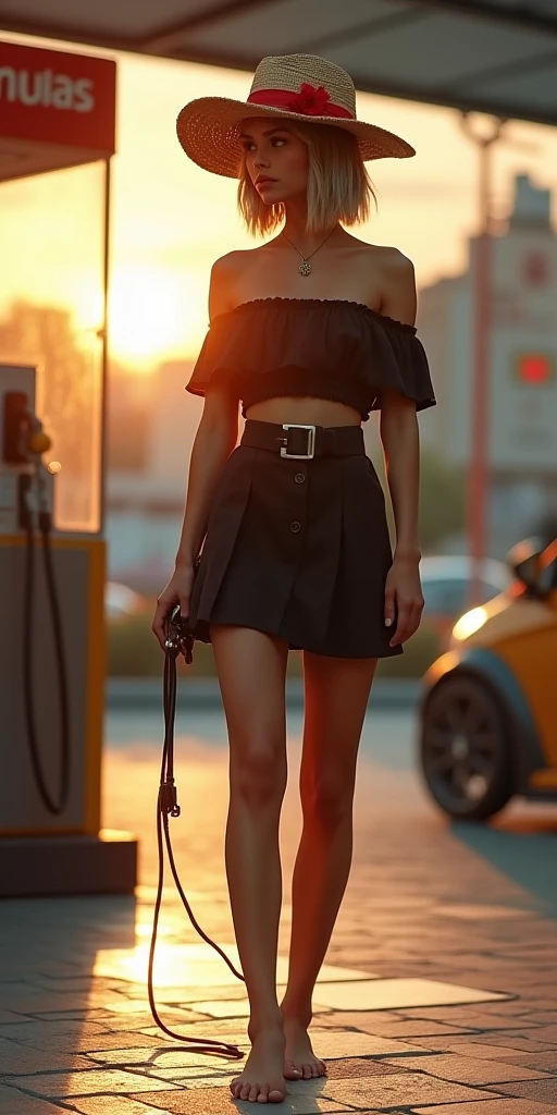 Full body front view of a stylish beautiful girl out of a future gasstation store, near a air cushion car, with a asymmetric hair cut, rugged straw hat with red ribbon, cyberpunk aestethic, medium breast, short black off-the-shoulder dress and black miniskirt, barefoot, ((( Show foot) )) foot on stony floor, view foot, heavenly beauty, 8k, 50mm, f/1. 4, high detail, sharp focus, cowboy shot, perfect anatomy, sunshine on her face, sunset, window side