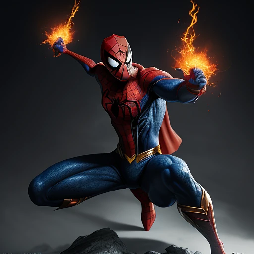 Spiderman but superman, one piece character, symmetric body, wielding a trishula, full body, extremely detailed, cinematic lighting, high contrast, artstation, character concept art, 8K:: background flames --q 2 --v 4 --stylize 600 --ar 9:16 --s 750 --v 5. 1