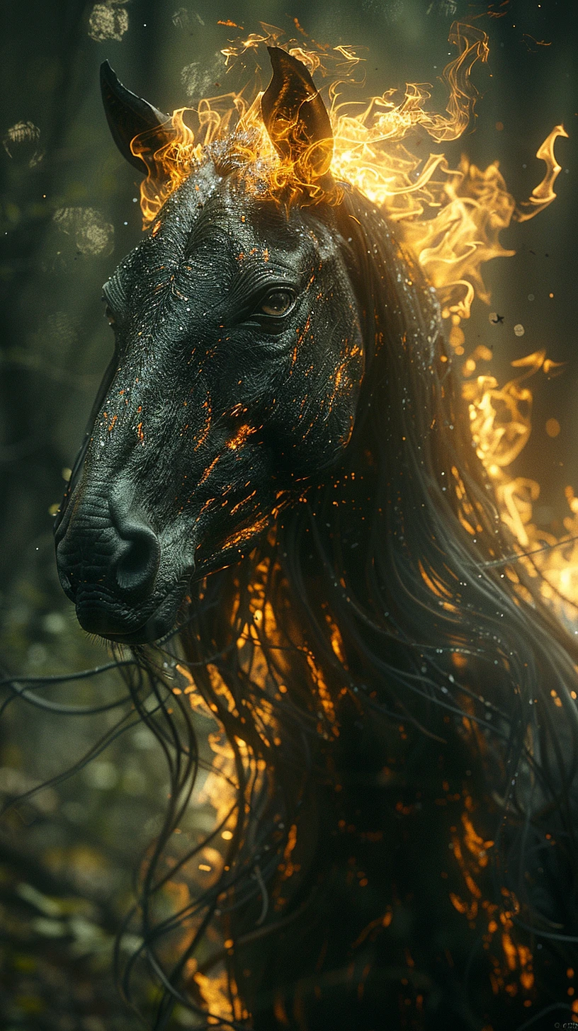 brazilian folklore headless mule with a flaming neck, super-detailed hypermaximalist cinematography, background of a dense forest, mule in prancing pose, full body, animal with black fur, light lighting, light shadows, 8k resolution,