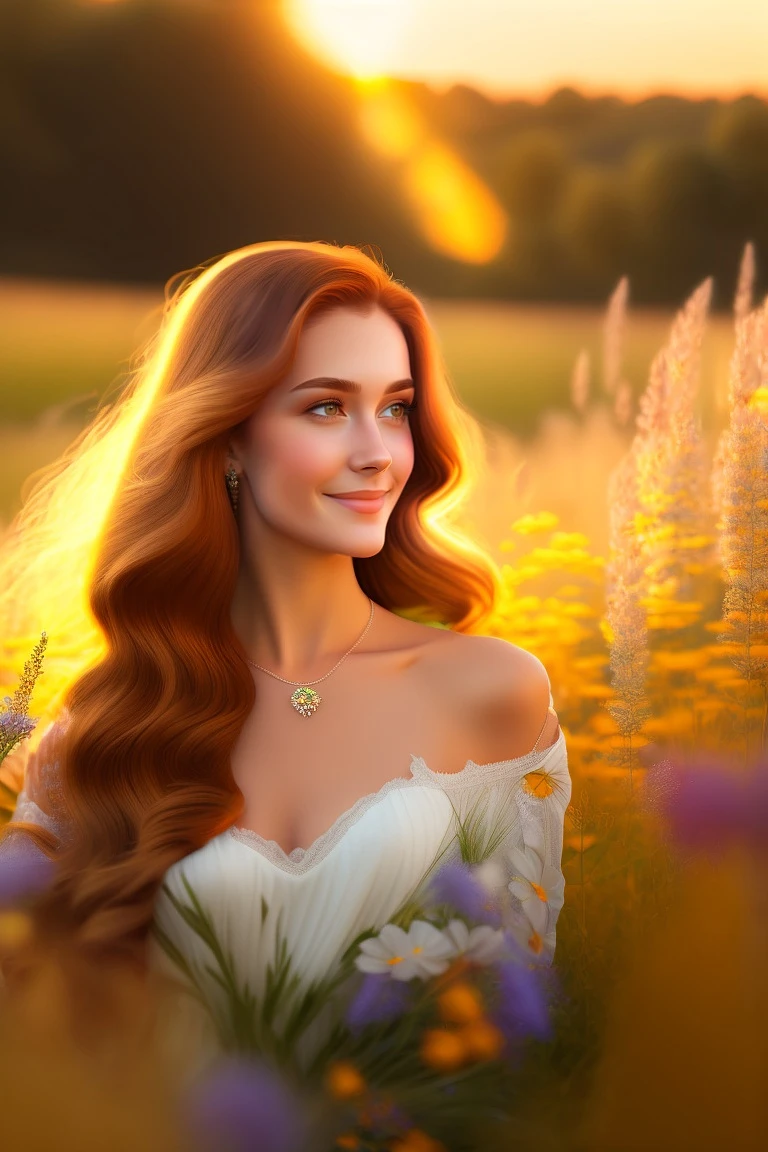 A graceful young lady with auburn locks, twirling in a field of wildflowers, illuminated by a golden sunset, hyperrealistic, 4k, portrait.
