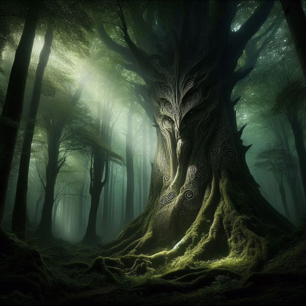 In the heart of a dense, mystical forest, Thalion, an ancient treant guardian, stands watch over the delicate balance of nature. The soft, dappled sunlight filters through his leafy canopy, casting intricate patterns of light and shadow on his towering, bark-covered form and revealing the subtle, glowing runes that mark his deep connection to the primal forces of the earth.