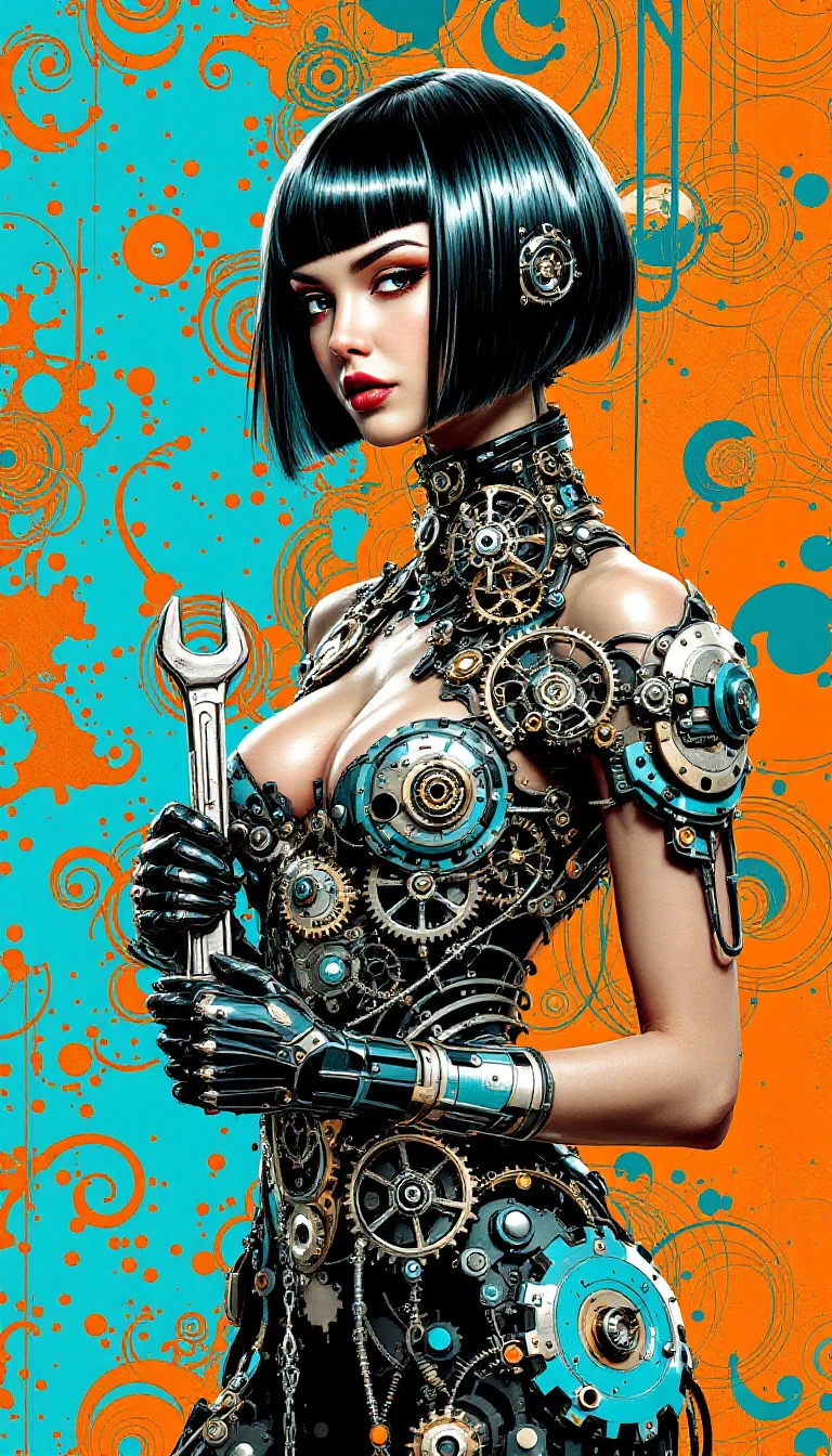 "Mechanical Marvel in Vivid Display": A figure with intricate clockwork components and stylized gears, rendered with a neo-photorealistic aesthetic, stands with confident posture, grasping a wrench. She has a sleek, dark bob and sharp, metallic features, set against a vibrant, cyan-orange backdrop with swirling abstract designs. Filigree accents and bold textures give this piece an avant-garde, almost surreal feeling.