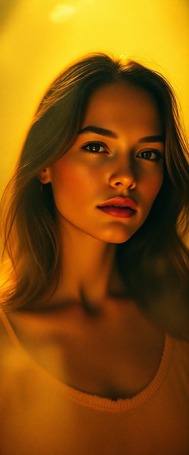 Professional fine art photograph, cinematic style, volumetric lighting, bright vibrant warm colours, surrealist composition. A supermodel, early twenties, delicate features, flawless skin, stands in soft contrasting light, beams of light through dust or fog. Film-like grain, soft saturation.