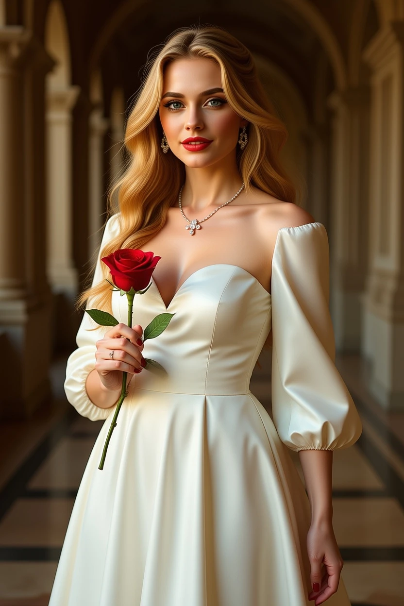 A high-resolution full-height vertical fashion portrait photograph captured with a Sony A1 and 120mm lens. A beautiful, stylish supermodel in her early 20s with fair skin stands in an opulent palace interior. Her long, straight auburn hair frames a heart-shaped face with defined features. Large, expressive emerald eyes gaze at the camera with a hint of a smile on her parted red lips parted full red lips that break into a smile during the scene. She wears a white silk gown with a deep V-neck and flowing sleeves, adorned with diamond earrings and necklace, holding a red rose right hand and lifting her dress gracefully left hand. Gentle, soothing, cinematic film composition with soft contrast and saturation, bathed in warm golden hour light just after sunrise or before sunset.