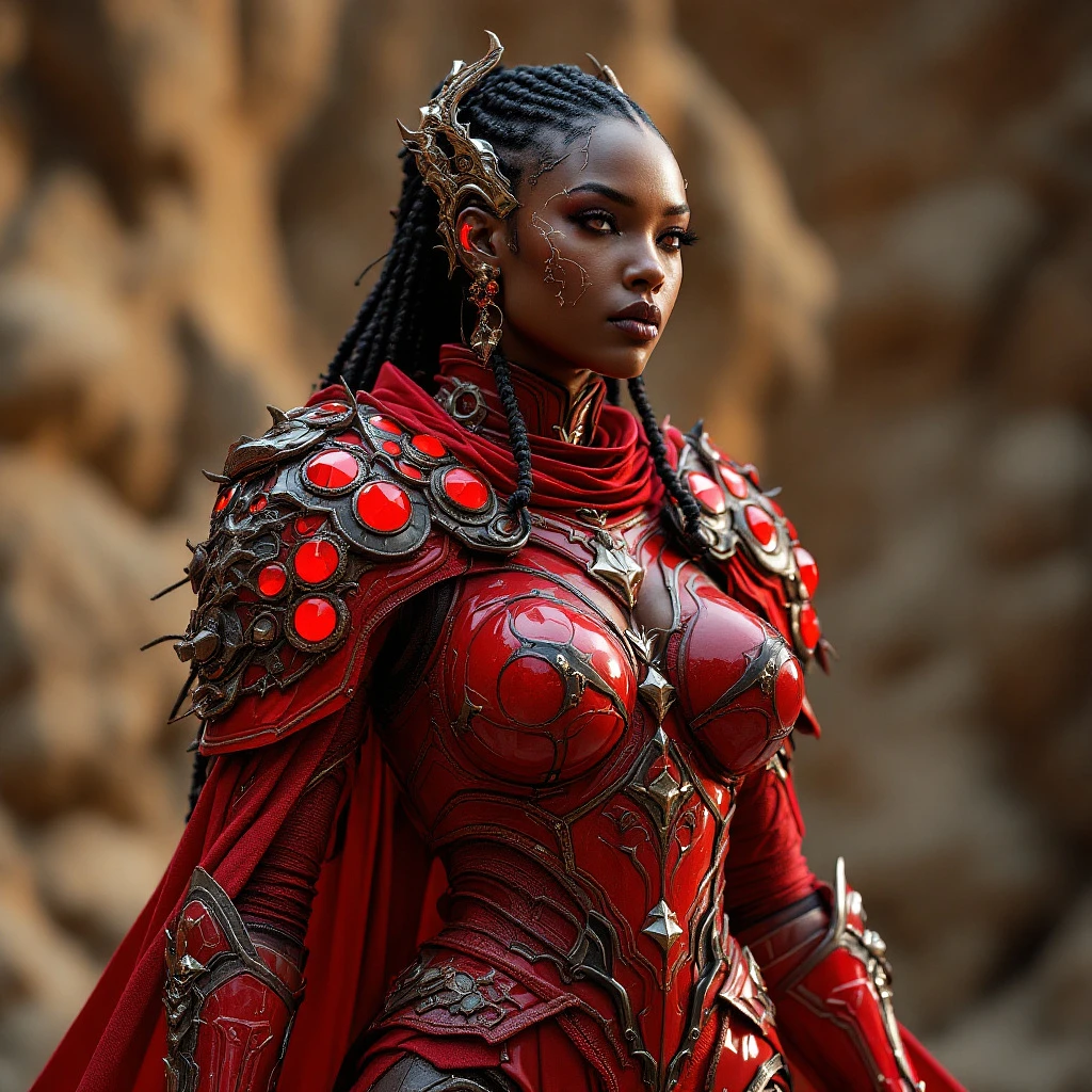<lora:openjourneyLora_v1:1> | Africangoddess warrior knight| sci-fi| beautiful futuristic space armor| decadent| divine| celestial| ((epic pose) )| ultra-realistic| battle worn| red| intricate | elegant | realistic | hyperrealistic | cinematic | highly detailed